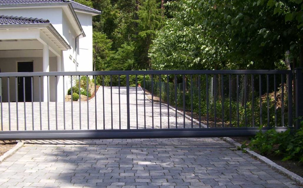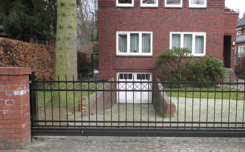 Die Schiebetore sind besonders robust, denn sie sind mit verstärkten Rahmen gefertigt. Die Last liegt auf einem Betonfundament, das in der Größe dem Schiebetor angepasst ist. Sie sind standardmäßig als freitragende Schiebetore bis 8 Meter konzipiert. Auswählbar mit vielfältigen Schmuckfüllungen oder auch klassisch, mit Staketen oder Gittermattenfüllung.